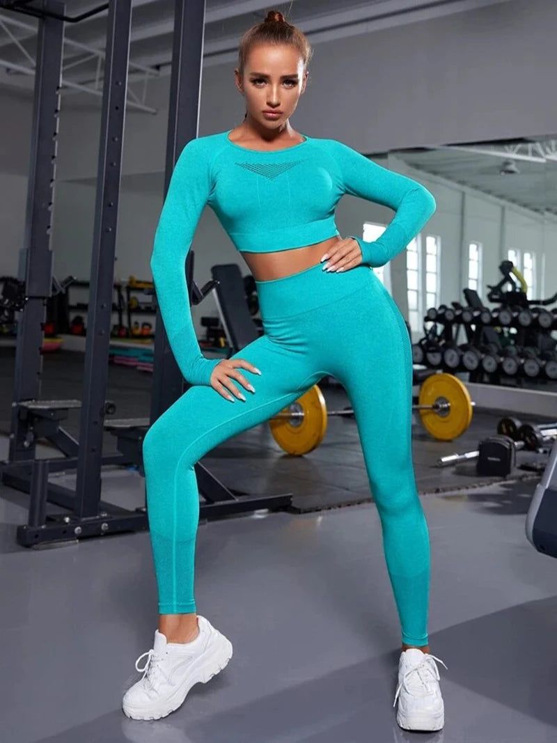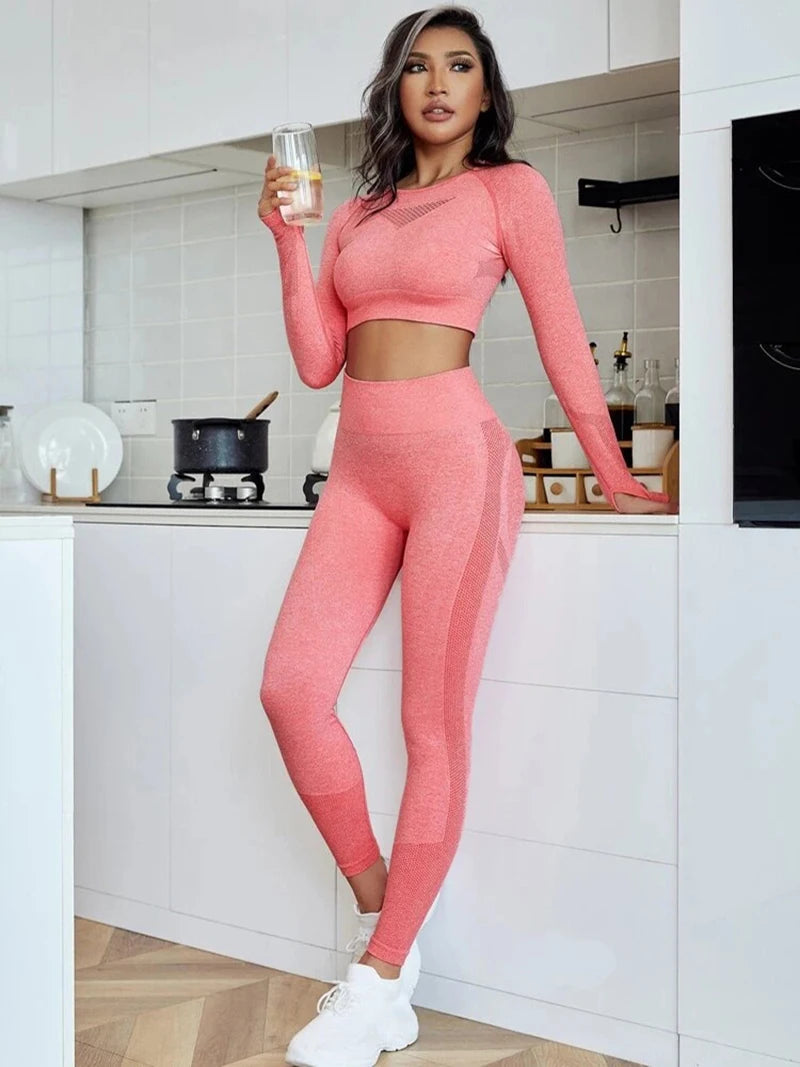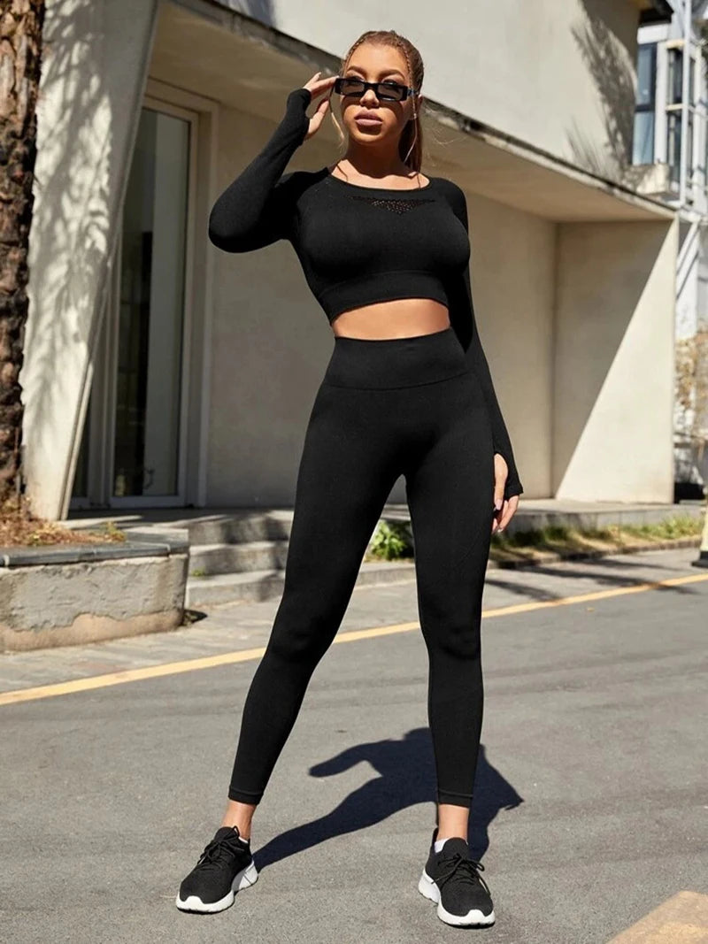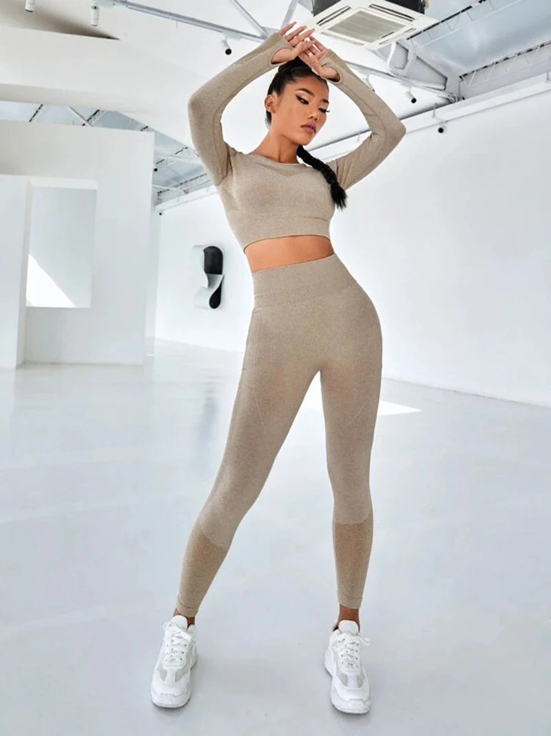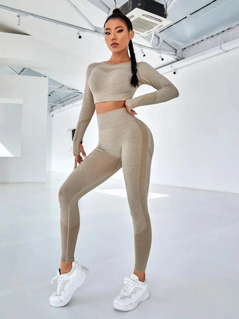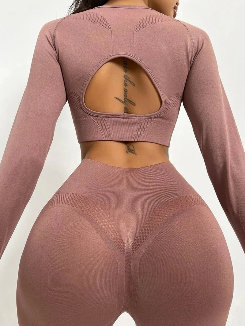 Exclusivité - Nouveaux ensembles Yoga Wear sans couture pour femmes, ensemble de sport, dos ajouré, manches longues, effet galbant sur les hanches, mode fitness